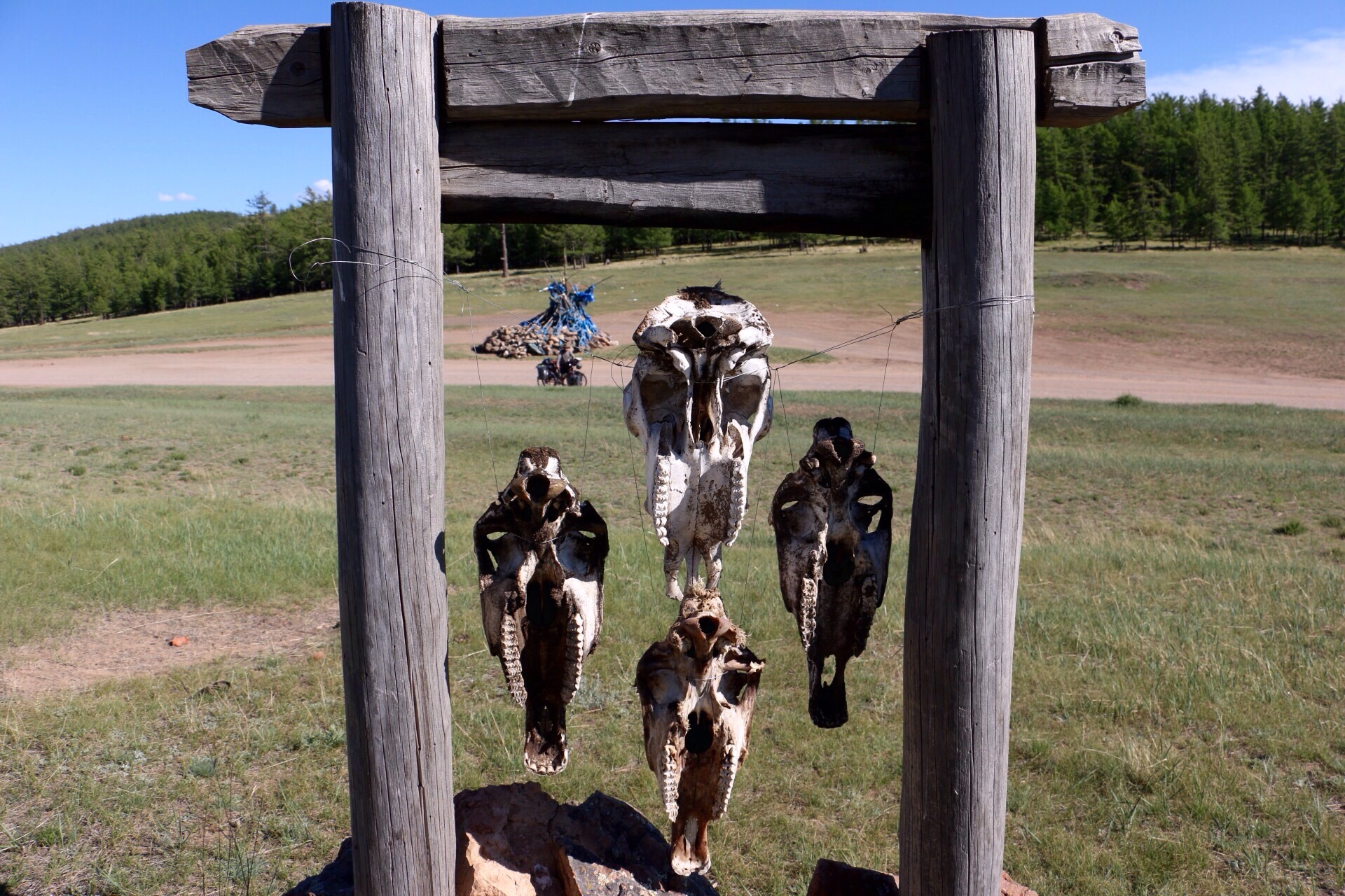 An inviting gate on the way into Tosontsengel. A quadrent of hanging horse sculls.