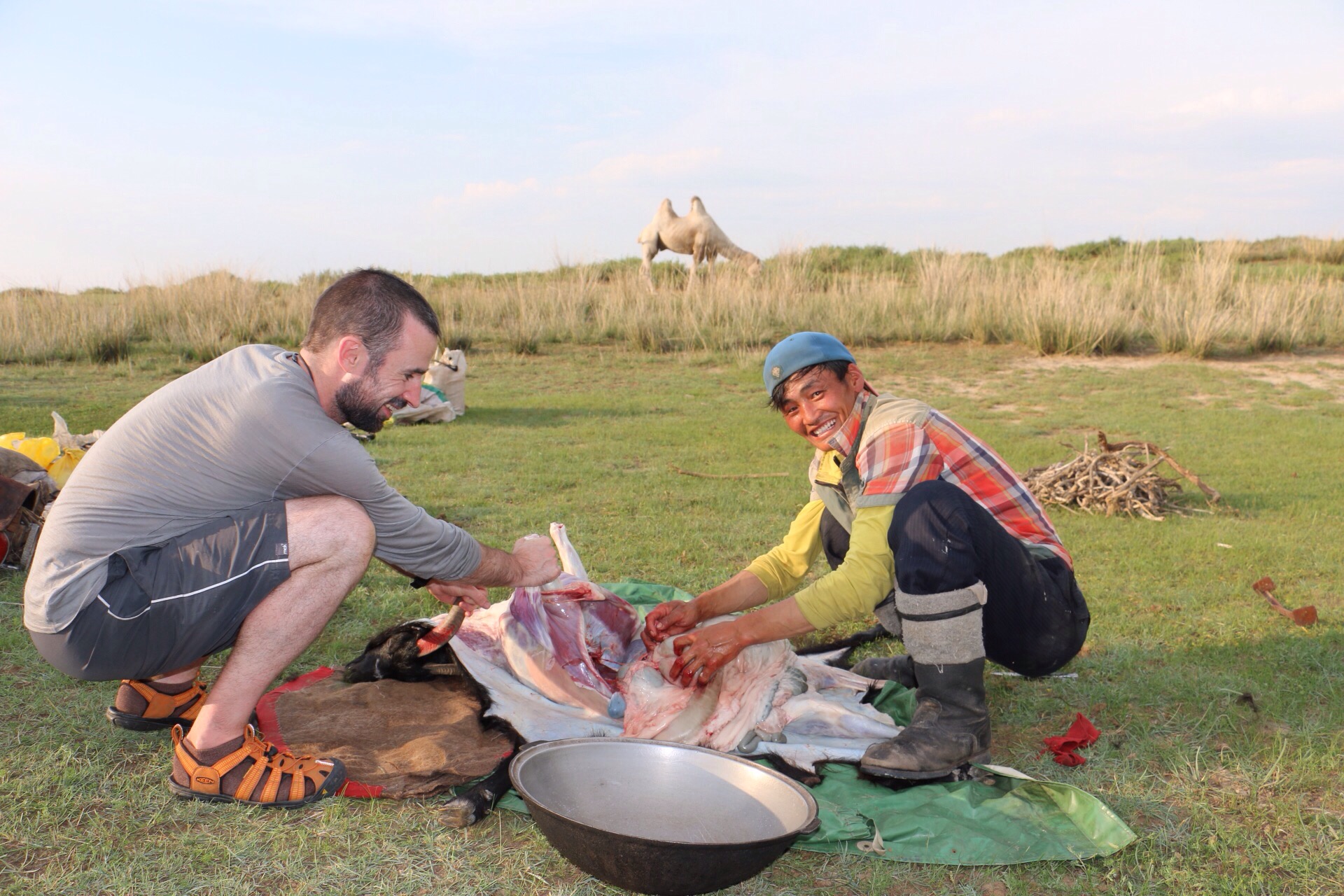 The next thing we knew they were lassoing a goat for supper. Ciaran reluctantly helped to skin the goat. We had khorkhog which involves heating rocks on a open fire then putting the hot rocks into the goats stomach with goat meat, veg and seasoning.