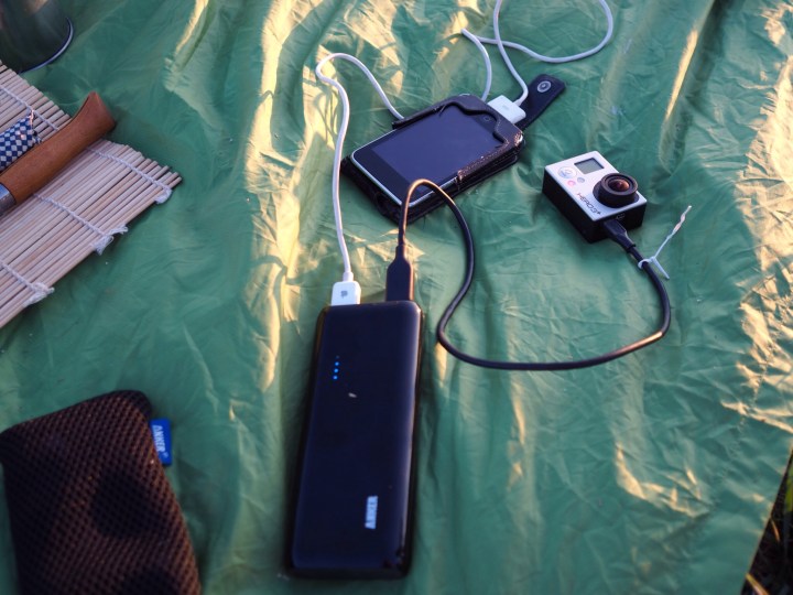 Alternatively he can charge a cache battery with the hub and from the battery charge devices when camp is set up. We use an Anker 2nd Gen Astro 5 battery.